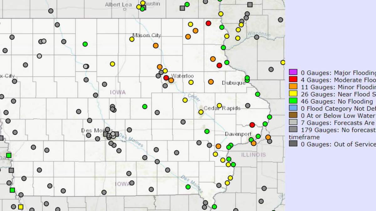 DES MOINES, Iowa - Several rivers in north central and eastern Iowa are in Flood Stage or Action Stage after a weekend of storms and heavy rain, and others are still rising.