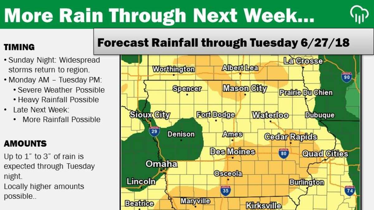 DES MOINES, Iowa - As local rivers in minor flood stage begin to drop this weekend, more rain is coming.