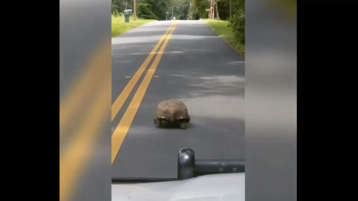 The deputy says he kept pace with the slow-moving tortoise as it moved down the Florida road for around twenty minutes before the reptile finally retreated into some nearby woods.