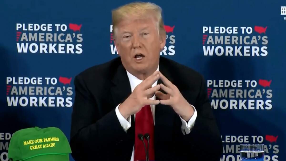 Trump set a green Make America's Farmer's Great Again cap on the table to one side. Iowa Republican Governor Kim Reynolds sat on the other.