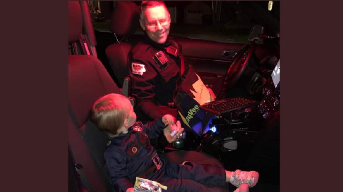 WEST DES MOINES, Iowa - A candid photo from West Des Moines Police Department's Cops and Candy Tuesday night is winning hearts as the littlest cop hangs out in the front seat of a police car with a real West Des Moines Police Officer.