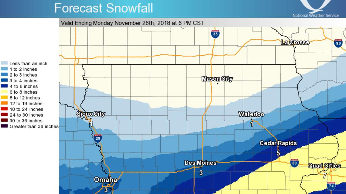 DES MOINES, Iowa - As we get closer to the expected winter storm in Iowa on Sunday the forecast for expected snowfall is becoming more precise.