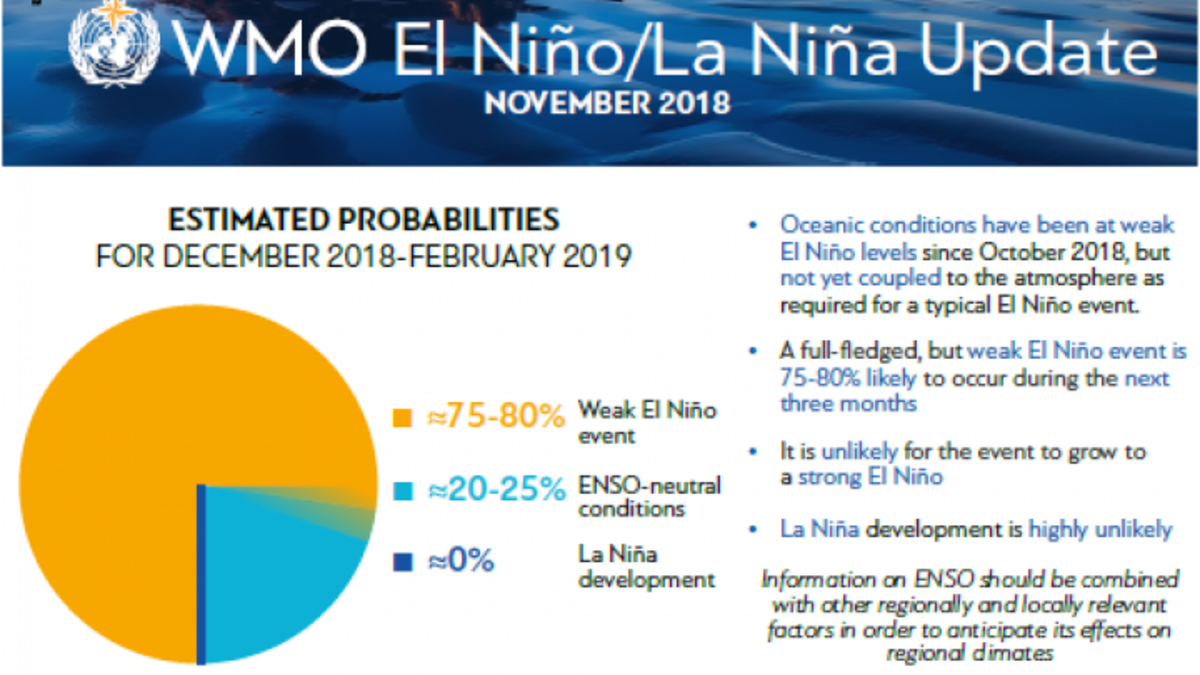 The World Meteorological Organization report gives a 75-80 percent chance of a full-fledged but weak El Niño over the next three months.