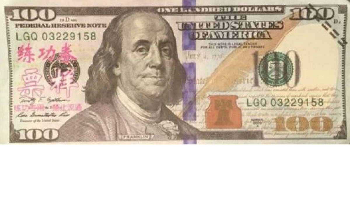 The fake currency has Chinese symbols or other markings on the front and back of the bill.
