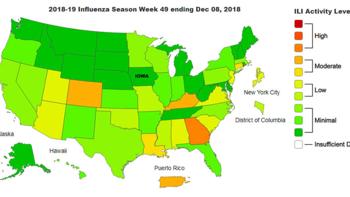There are flu cases reported across the country, but most states only seeing sporadic reports of flu. Iowa has only 136 confirmed cases of flu this past week, and Iowa school absences from the flu at two-percent.