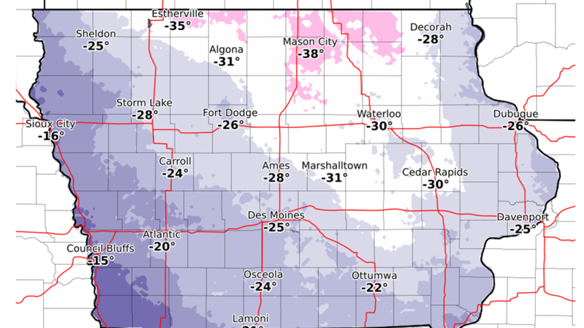 DES MOINES, Iowa - As Iowans clean up after the ice and snow from Tuesday into Wednesday, next up is blowing snow and bitter cold. The map above from the National Weather Service shows expected wind chills in Iowa Thursday night.