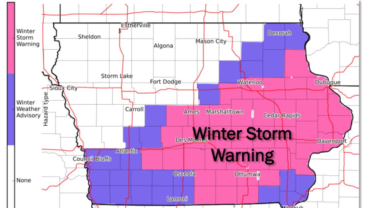 Winter Storm Warning includes the Des Moines Metro, Davenport and Quad Cities, Ames, Cedar Rapids, Waterloo, and Dubuque metros. A Quad Cities specific map is below.