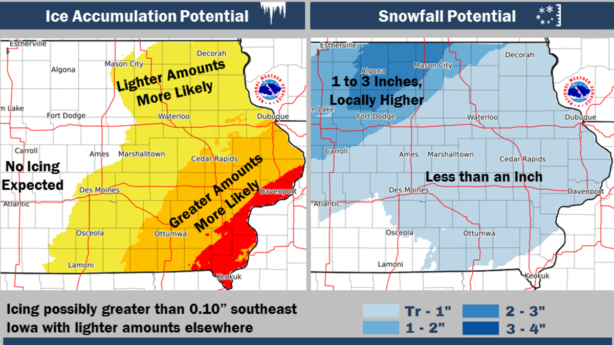 Ice amounts near 2/10 of an inch are possible over southeast Iowa, a tenth of an inch or more from Cedar Rapids through Ottumwa. Closer to Des Moines the ice is likely around a tenth of an inch or less.