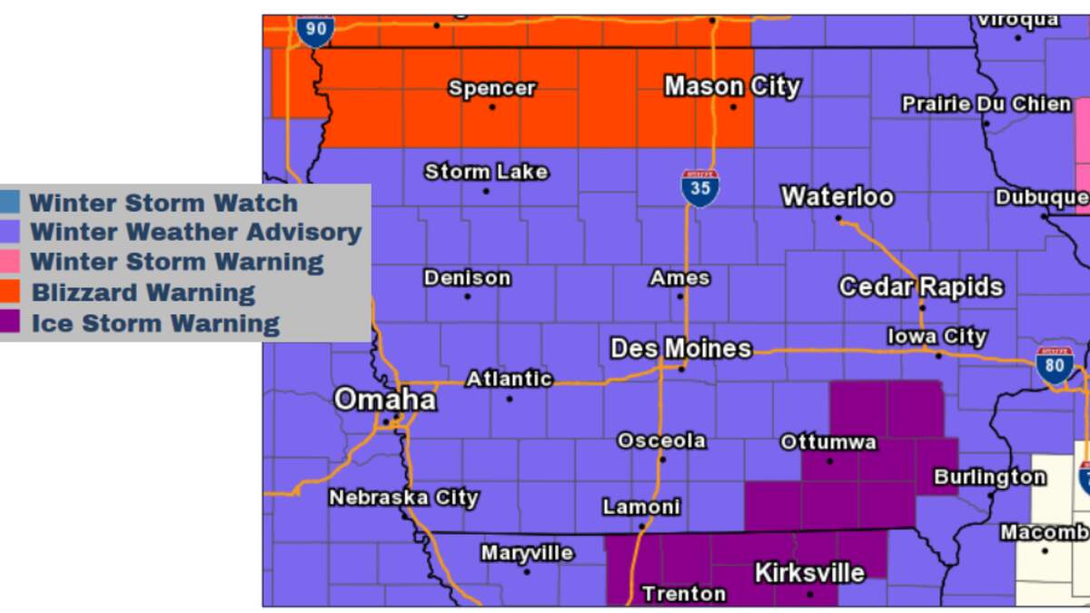 DES MOINES, Iowa - A Blizzard Warning is in effect for North Central and Northwest Iowa from noon today until 12 AM on Friday. A Winter Weather Advisory is in effect for much of central Iowa until 6 PM today.
