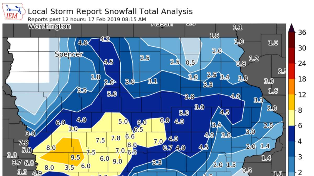 The heaviest snow fell to the west of Des Moines, where 7, 8, 9.0 inches at Winterset, and even 9.5 inches of snow at Atlantic. The I-80 corridor west of Des Moines is listed as no travel advised by the Iowa Department of Transportation at 8:20 a.m. Sunday. Many roads west and southwest of Des Moines are also listed as no travel advised.