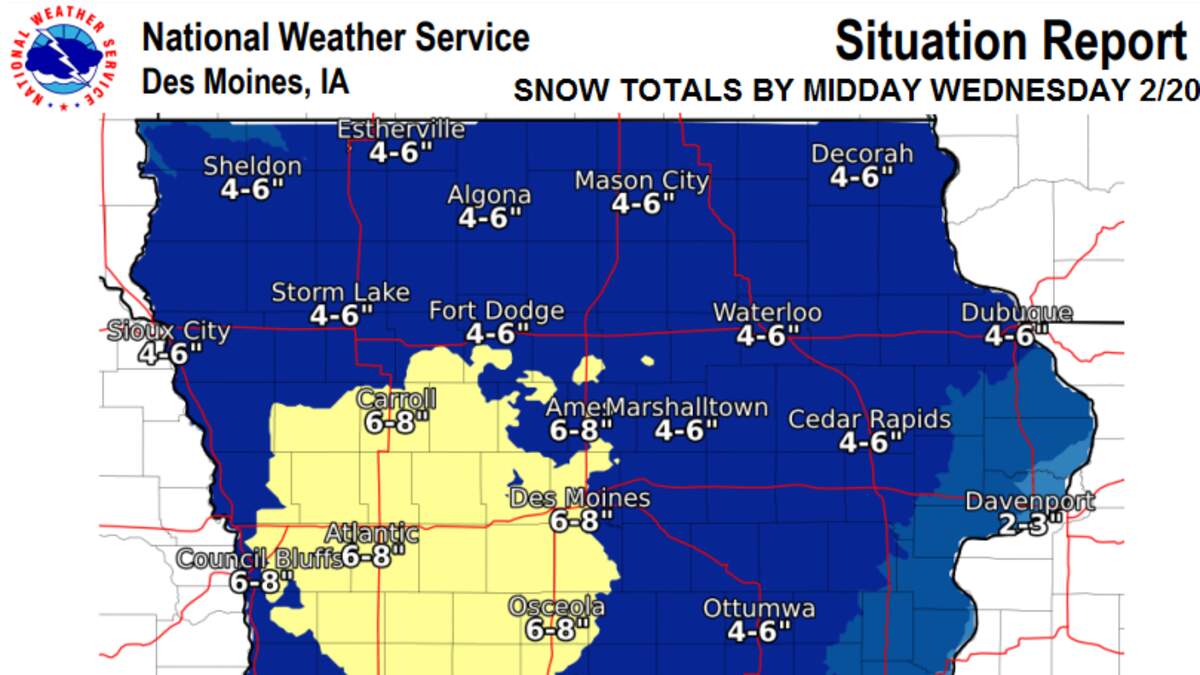 DES MOINES, Iowa - Another snow storm is coming Tuesday night to Wednesday with Central Iowa again in the bulls-eye for 6-8 inches of snow.