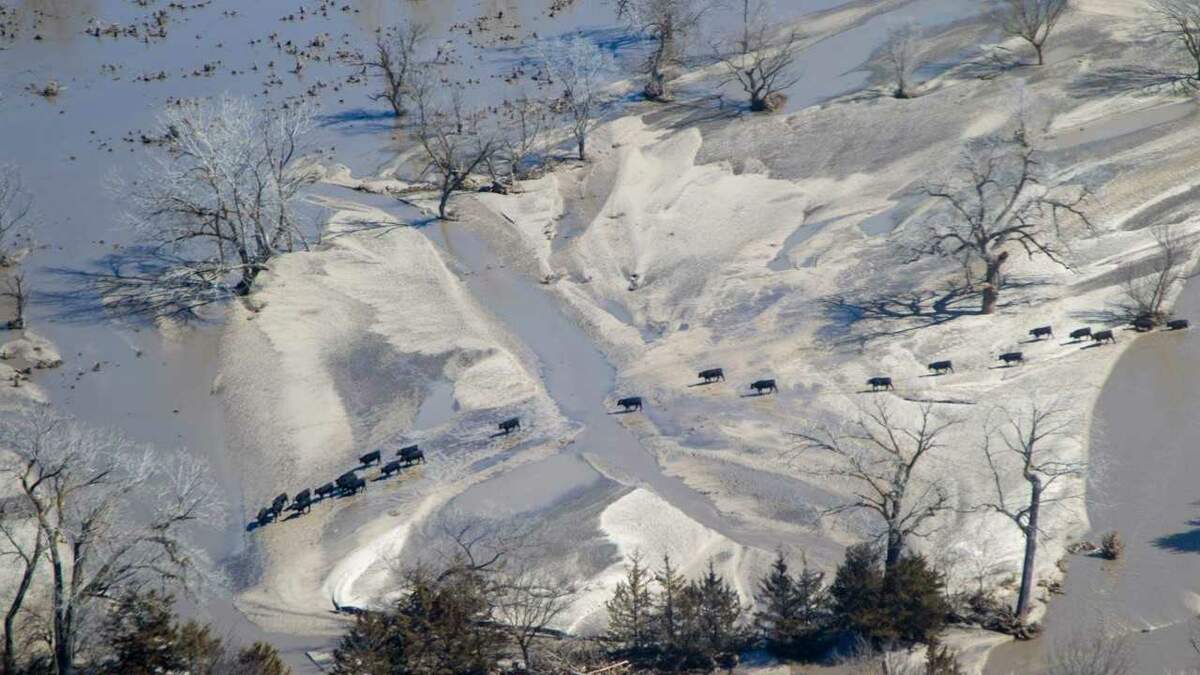 OMAHA, Nebraska - The National guard is dropping massive hay bales to feed cattle stranded after flooding.