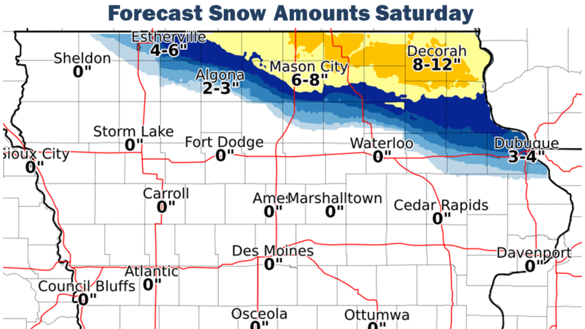 The National Weather Service says a band of 3 to 6 inches is likely with locally higher amounts possible closer to the Minnesota border in northeast Iowa. As much as 7-9 inches is possible in Mason City, near the I-35 corridor in North Central Iowa, and up to 12 inches of snow is possible in Decorah, in the far Northeastern part of the state.