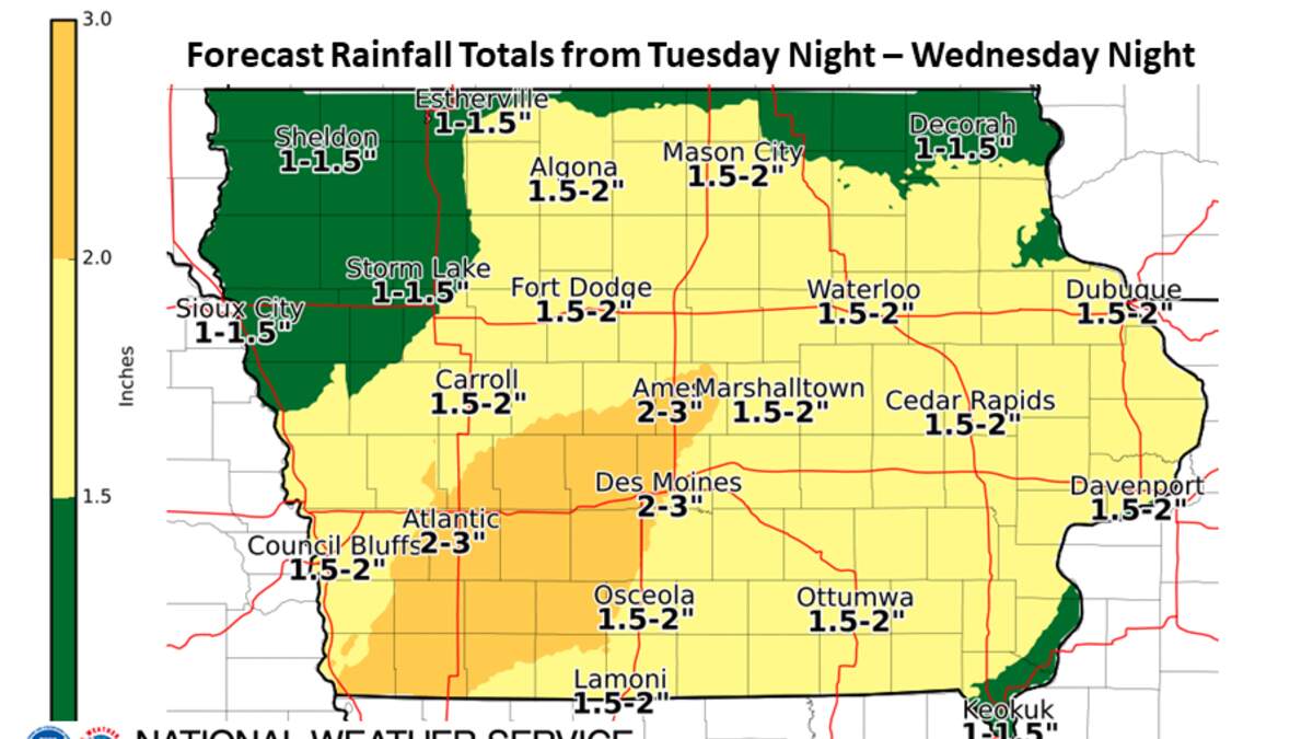 Much of the rest of Iowa is likely to see one-and-a-half to two inches of rain, including Fort Dodge, Mason City, Waterloo, Marshalltown, Cedar Rapids, Iowa City, Davenport, and Ottumwa from Tuesday night to Wednesday night.