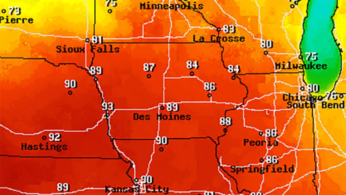 In Central Iowa, the Des Moines and Ames area will be within one or two degrees of the temperature record of 90.