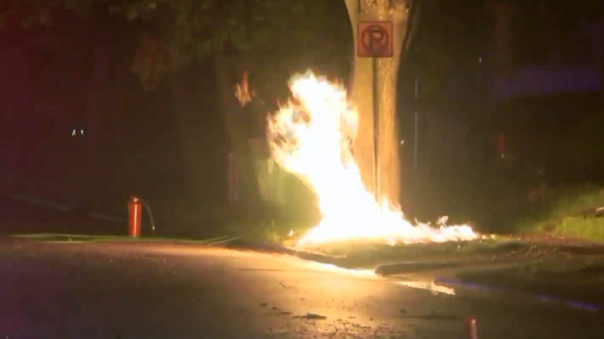 Firefighters say lightning hit a no-parking sign, traveled into the ground, and then ruptured a natural gas line, setting a nearby tree on fire, with the gas feeding the fire until utility crews could shut off the gas line. Photo below from WHO TV 13.