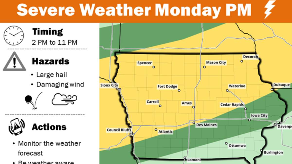 DES MOINES, Iowa - Strong to severe thunderstorms are possible Monday afternoon through the evening hours across the region from Nebraska through Iowa, and on into neighboring states.