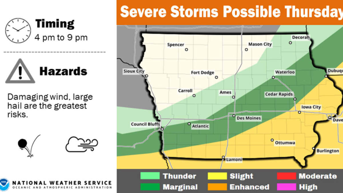 DES MOINES, Iowa - Thunderstorms are expected to develop in Iowa this morning and again later in the afternoon and move southeast through mid to late evening.