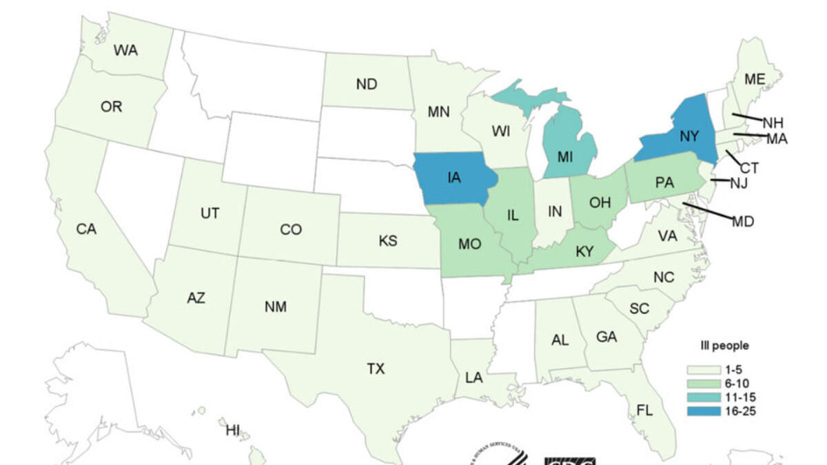 Iowa has had more confirmed cases of than any other state, 23. Illinois has 10 confirmed cases, Missouri 7, and Nebraska none.