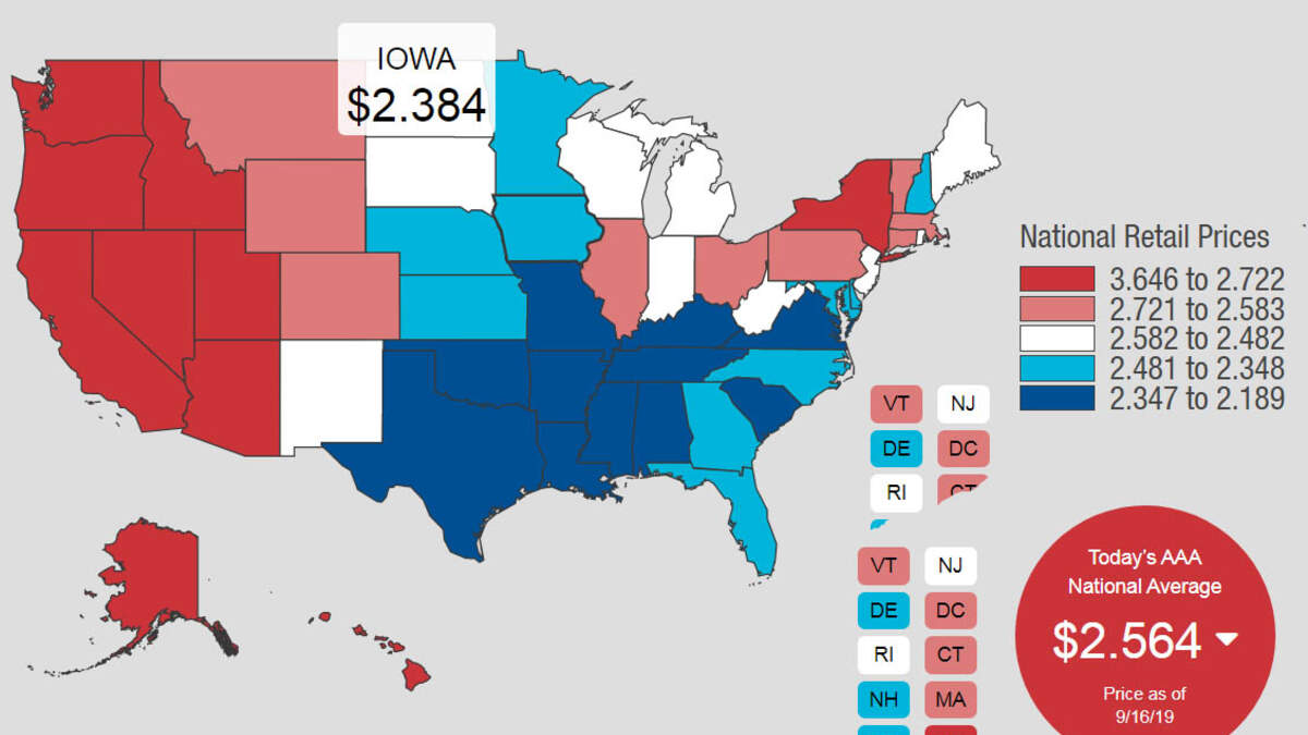 The national average price this morning is $2.56. The Iowa average for a gallon of gas is $2.38 according to AAA.