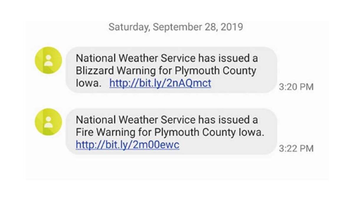 DES MOINES, Iowa - Some people in Iowa are getting Blizzard Warning and Red Flag Fire Warning text messages.