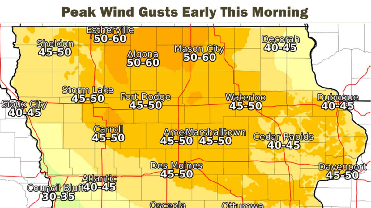For the rest of Iowa, the Wind Advisory ends at 4 this afternoon, and the High Wind Warning in Northern Iowa ends at 10 a.m. posted by the National Weather Service in Des Moines.