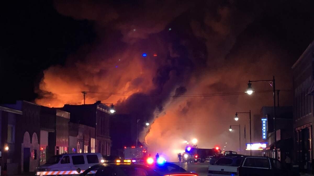 OGDEN, Iowa - There's nothing left of the downtown Ogden grocery store. Flames were reported fifty feet into the air as the Ogden Mart was consumed by the fire, most of the walls of the building collapsing at the end, leaving only the skeletal front facade as firefighters brought the fire under control.