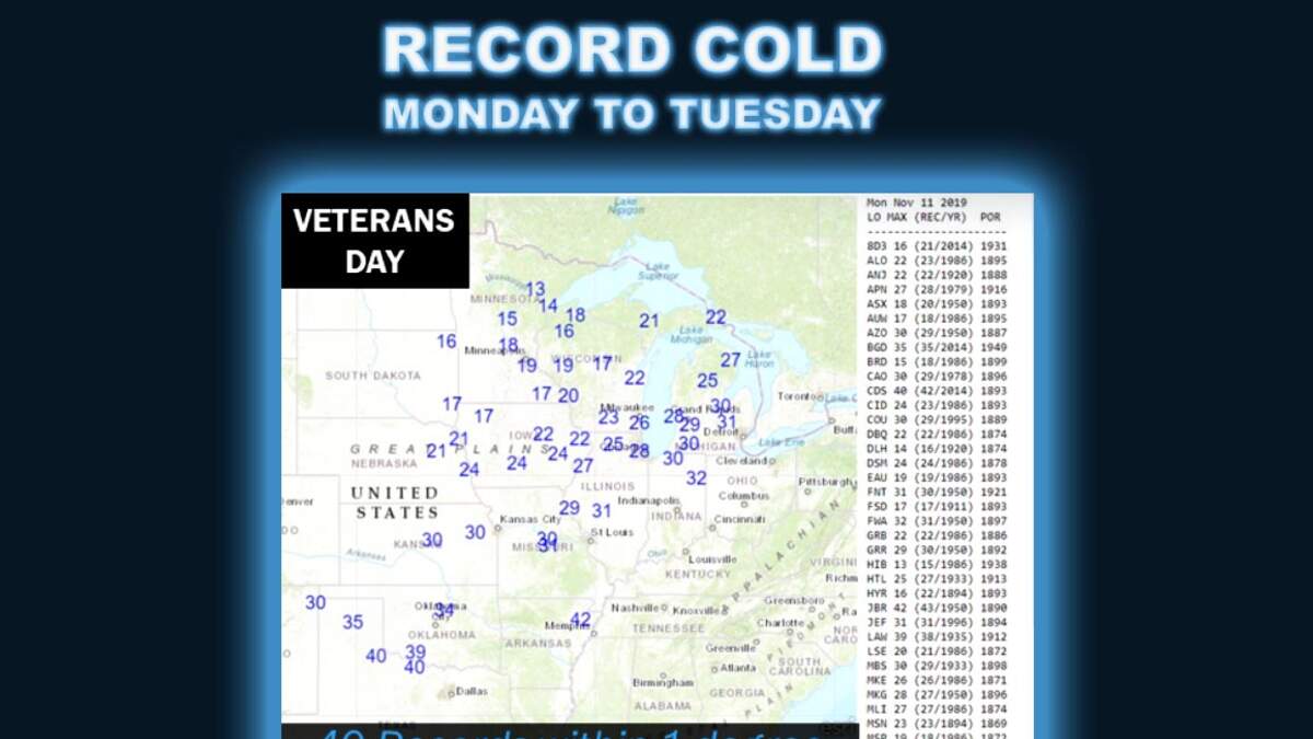 OMAHA, Nebraska - Record cold temperature records will be challenged Monday into Tuesday from Omaha through Des Moines, Ames, Cedar Rapids, Davenport, and then throughout the Northeastern United States.