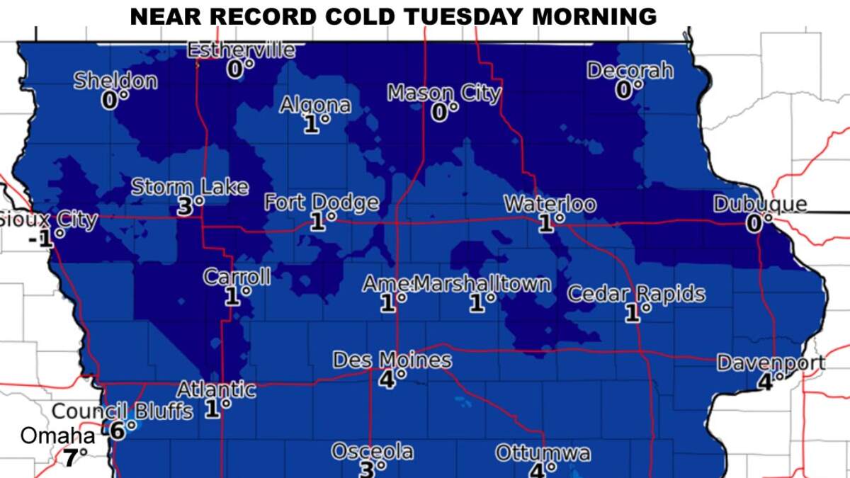 DES MOINES, Iowa - After the snow, comes record cold temperatures across the Nebraska-Iowa-Illinois region. Some areas will come close, and possibly tie cold records on Monday into Tuesday, but several areas are expected to set new cold records.