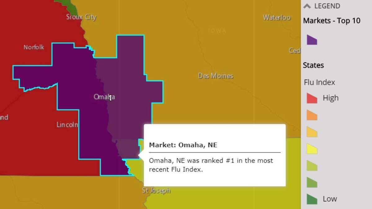 The Walgreens Flu Index ranks Omaha and Nebraska as the top city and state for flu activity based on cases of people being treated with antiviral prescriptions.