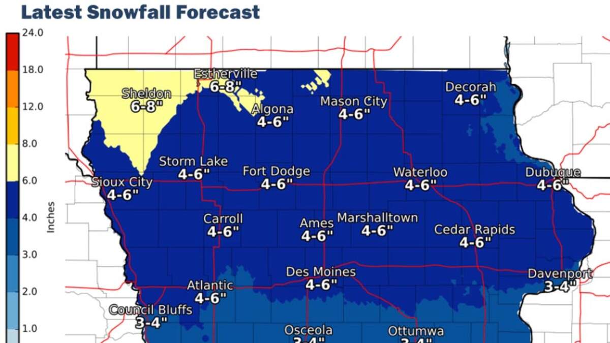 DES MOINES, Iowa - Widespread snowfall is moving through the region from Eastern Nebraska through Iowa and continuing eastward into Illinois through the afternoon hours.