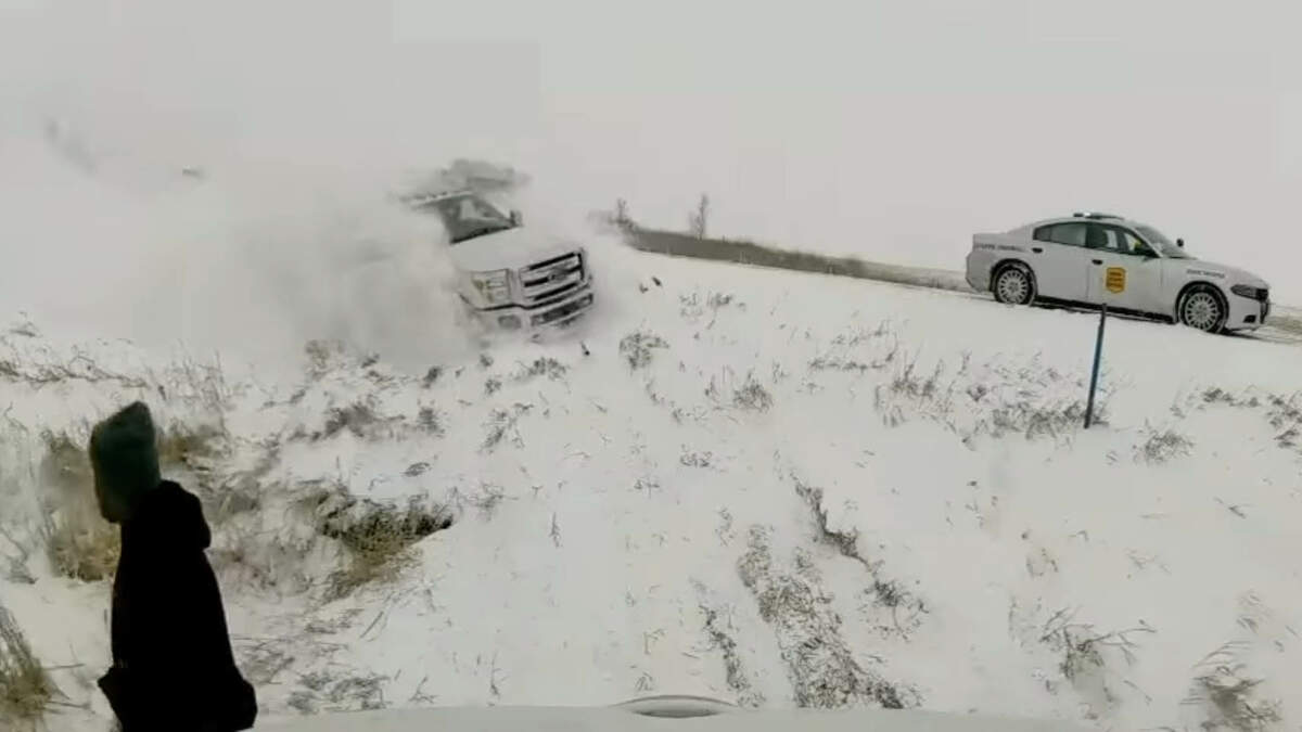 A State Trooper and an AMCON Distributing delivery truck driver who slid into the ditch went running when a pickup flew off I-80 at highway speed and slammed into the delivery truck.
