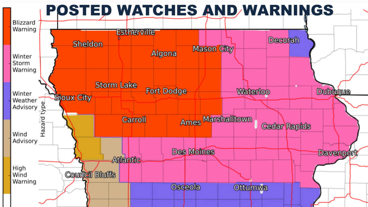 A Winter Storm Warning is posted for Des Moines to the east, through Cedar Rapids and Iowa City, and including the I-80 corridor east of Des Moines all the way to Davenport, and south of Des Moines to near Osceola, Ottumwa, and Wapello. The rest of Northeastern Iowa, east from Mason City and Marshalltown is underr a Winter Storm Warning.
