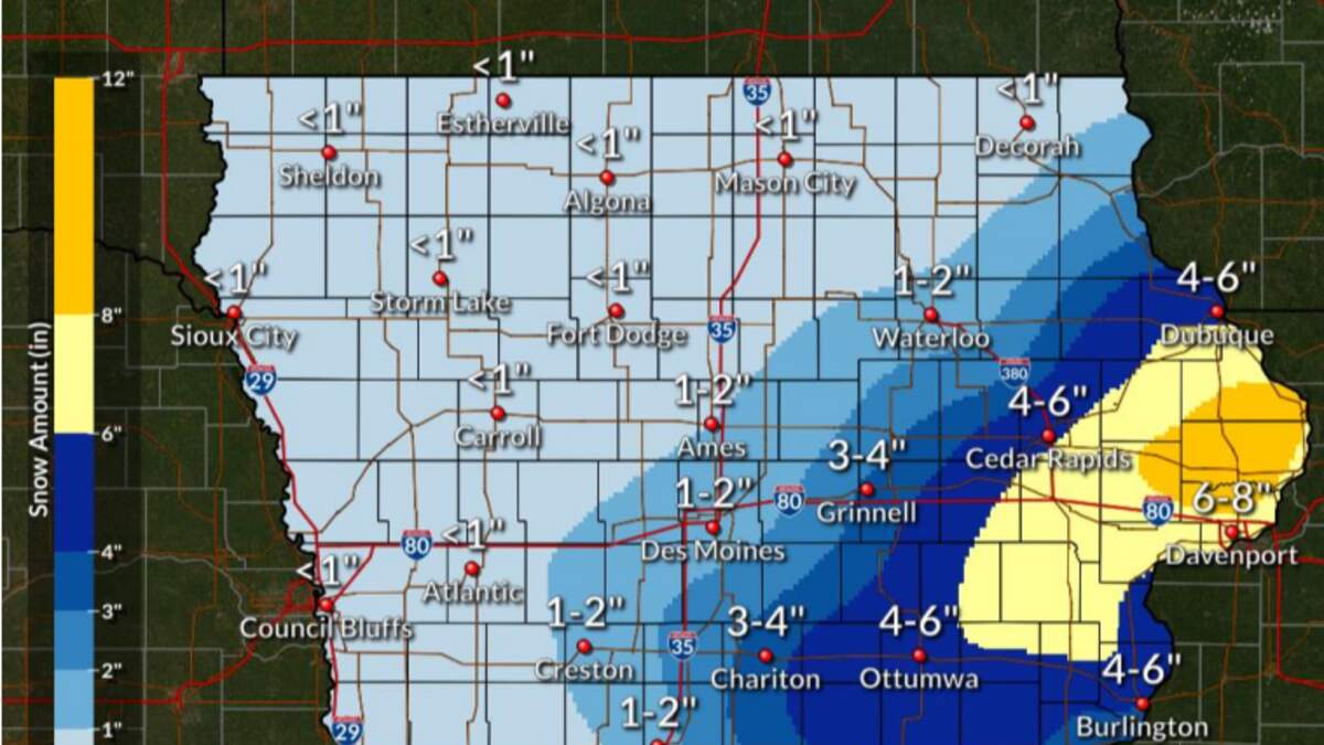 Snow accumulations are expected to be highest over far East Central Iowa from about Iowa City to the Quad Cities area, where 6 to more than 8 inches of snow is possible. The eastern stretch of I-80 from east of Des Moines through the Quad Cities area will see some of the heaviest snow.