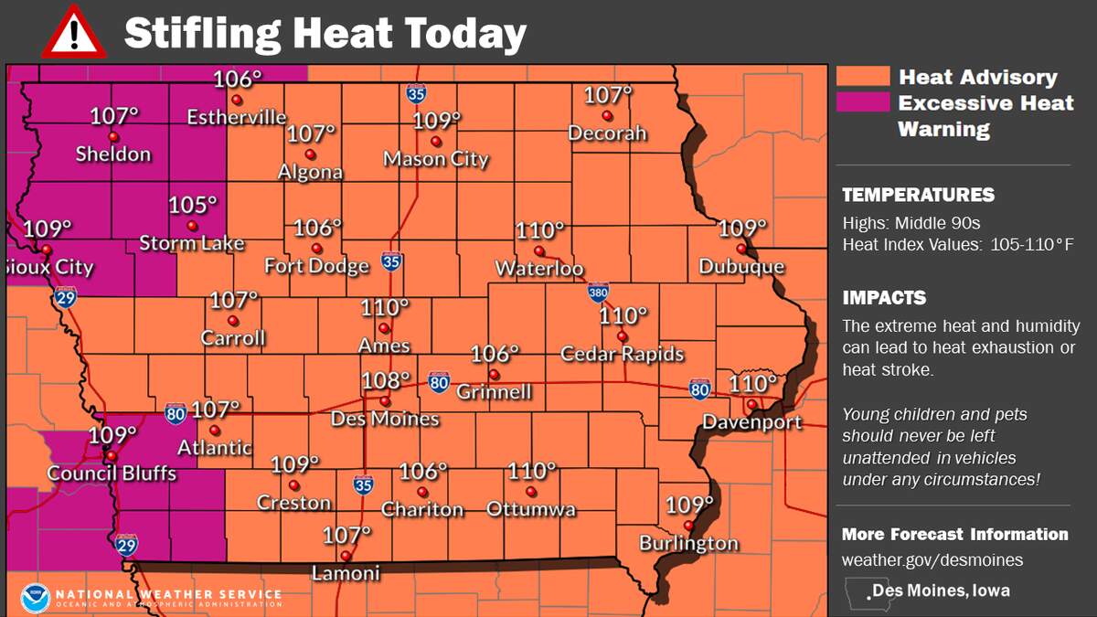 DES MOINES, Iowa — High temperatures into the mid-90s with humid conditions today will result in heat index values over 100°F by this afternoon.