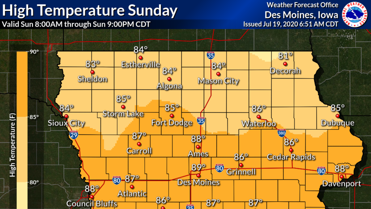 DES MOINES, Iowa - We'll see mostly sunny skies, cooler temperatures, and less humidity Sunday across Iowa.