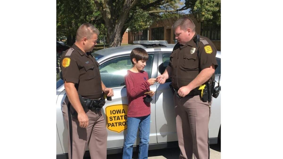 A trooper recently stopped a driver in western Iowa's Monona County, but the driver got out of the vehicle and ran. The boy saw the suspect hide under a neighbor's deck, and told his parents. Deputies were then able to quickly find the suspect, was arrested on traffic and drug charges. Troopers stopped by the boy's school recently to thank him in person. They gave him an Iowa State Patrol patch, Junior Trooper stickers and a District 4 challenge coin.