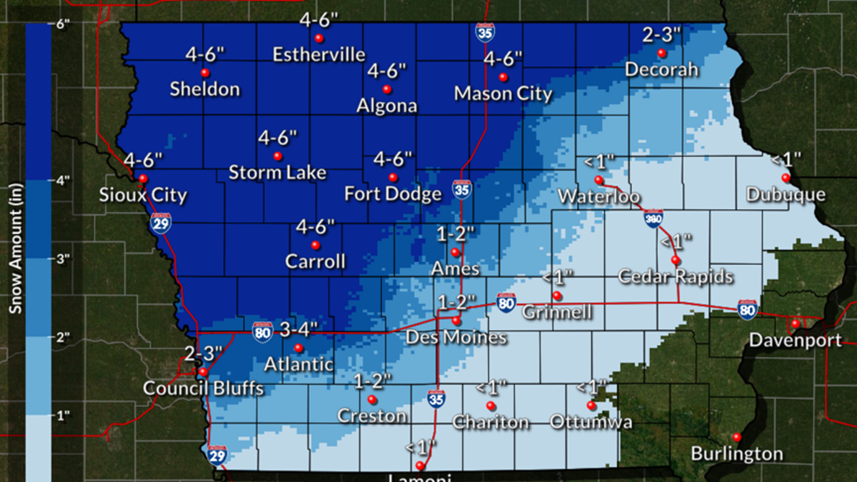 Des Moines and Ames in Central Iowa may see 1-2 inches. The northwest third of Iowa is likely to see 4-6 inches of snow roughly in the area north of I-80 and west of I-35.