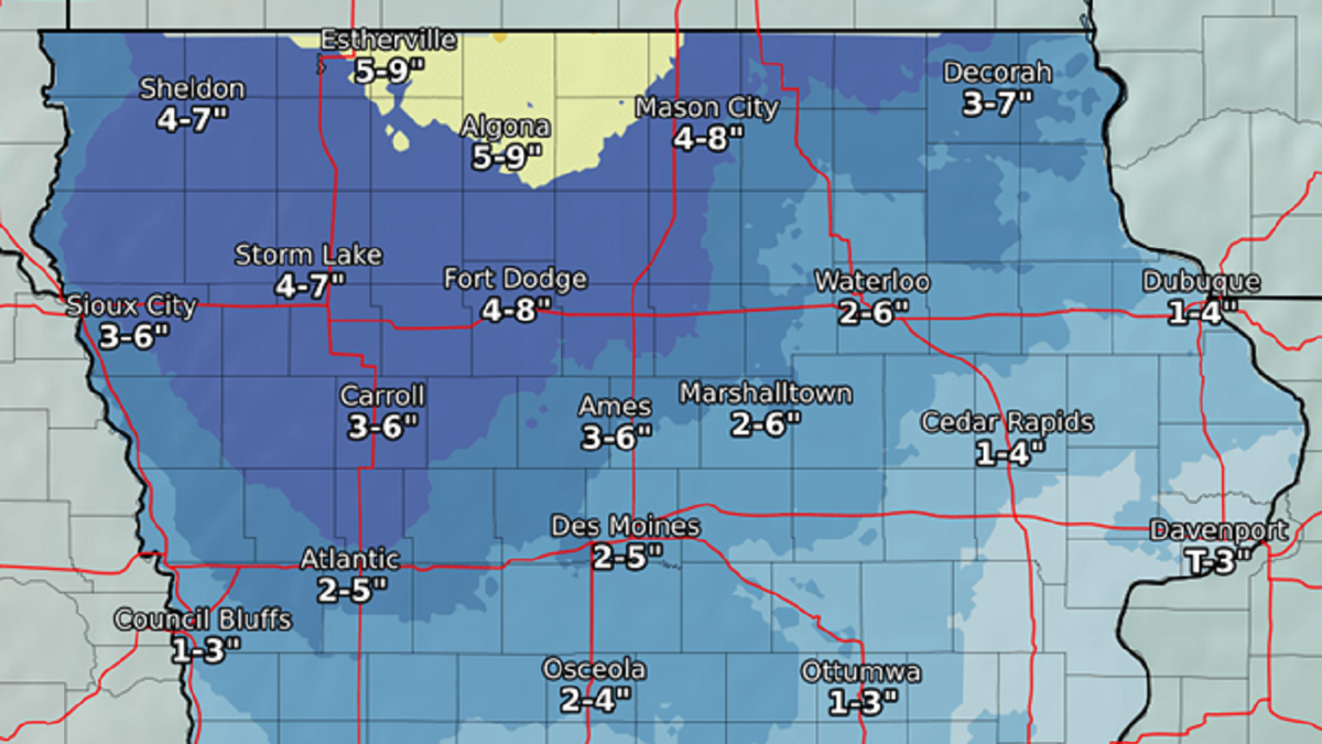 Des Moines, IA -- A winter storm will dump up to almost a foot of snow in parts of Northwestern Iowa Thursday into Friday, with blizzard conditions likely in Western Iowa Friday. The Des Moines area is likely to get four to eight inches of snow.