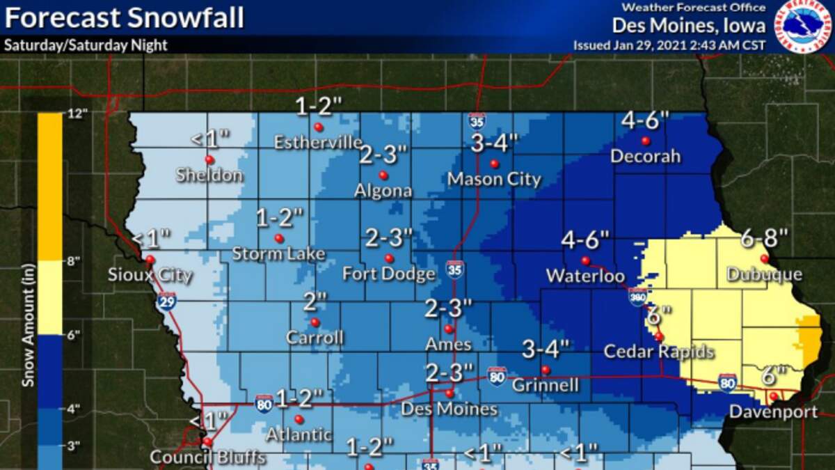 In Eastern Iowa they're looking at the possibility of roughly a half-foot of snow this weekend. KCRG-TV 9 says it'll start in the afternoon in the Cedar Rapids area, and the storm will spread across Eastern Iowa with heavy snow in the late afternoon and evening, with 4 to 8 inches of snow possible. South of I-80 two to four inches of snow is likely.