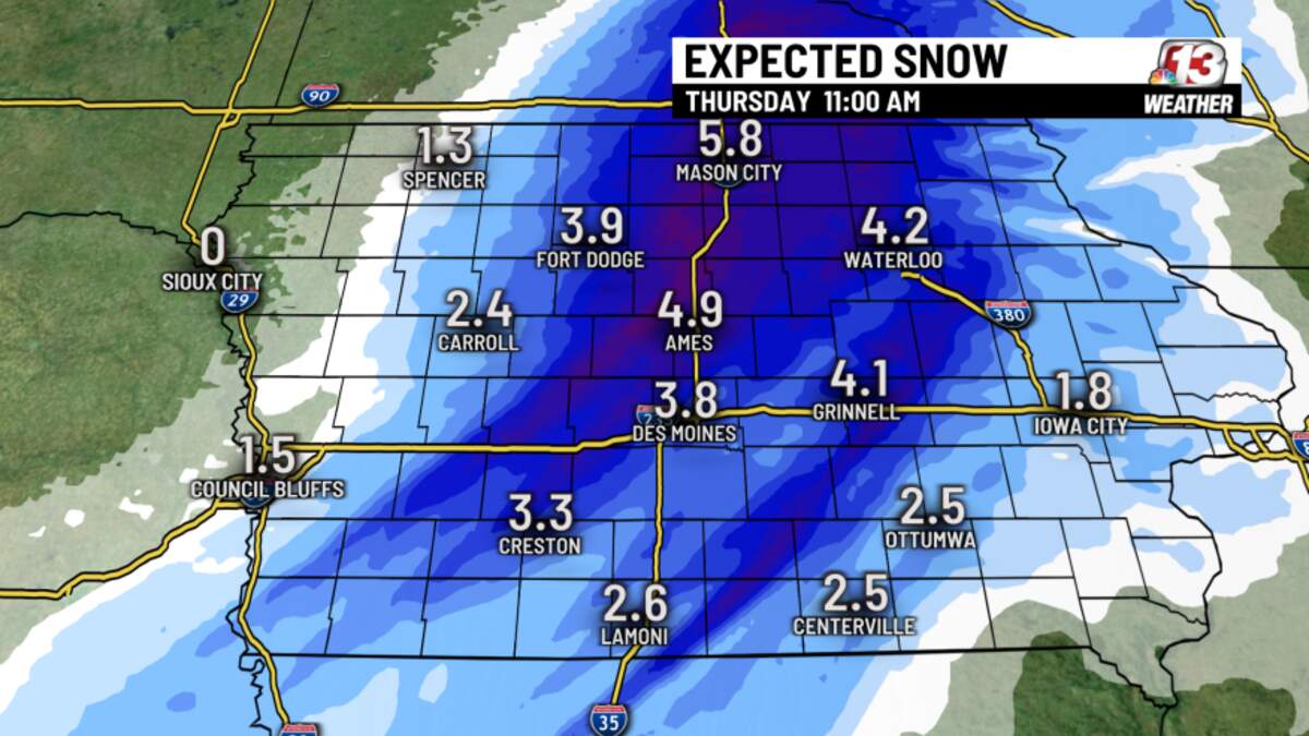 The area from Fort Dodge to Ames to Grinnell marks the southern boundary of a Blizzard Warning. WHO-13 Meteorologist Jeriann Ritter says Ames will get nearly five inches of snow, and with high winds there'll be white-out conditions. This includes much of the I-35 corridor to the north.