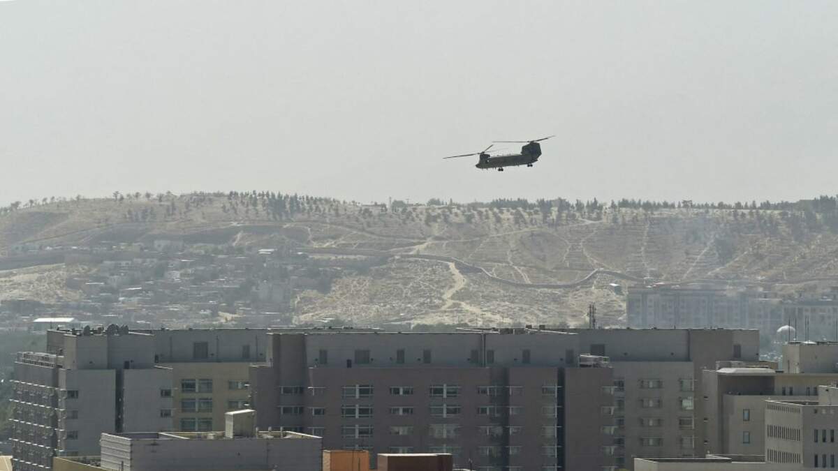 A U.S. Chinook military helicopter flies above the US embassy in Kabul yesterday. Several hundred employees of the US embassy in Kabul have been evacuated from Afghanistan, a US defense official said.Photo: AFP