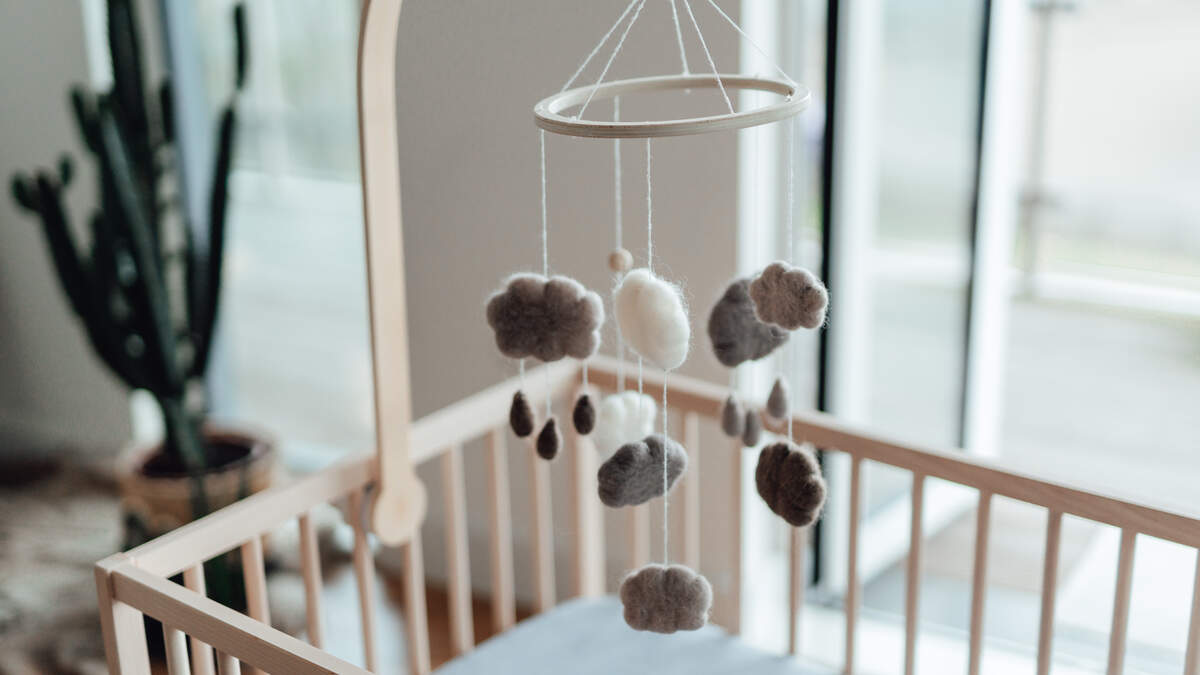 Stylish Scandinavian newborn baby nursery with natural wooden baby cot and handmade mobile hanging over it