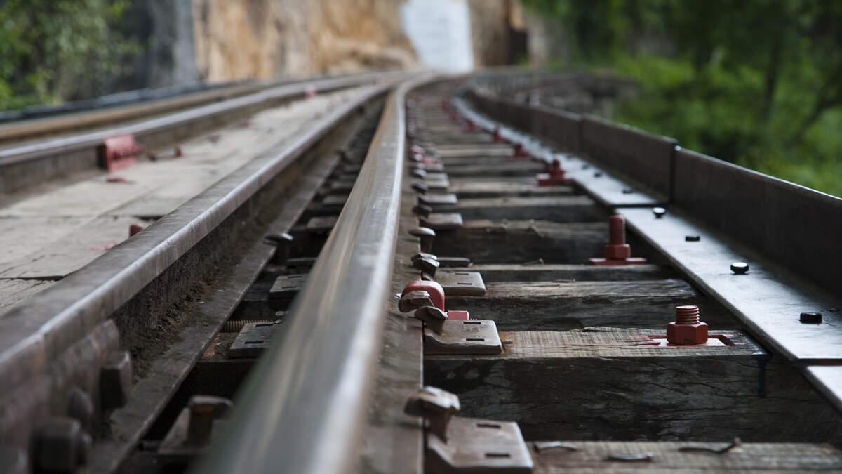 Close-up of rail tracks on wooden trestle viaduct of Trans-River Kwai Death Railway at Saphan Tham Krasae, near Kanchanaburi.