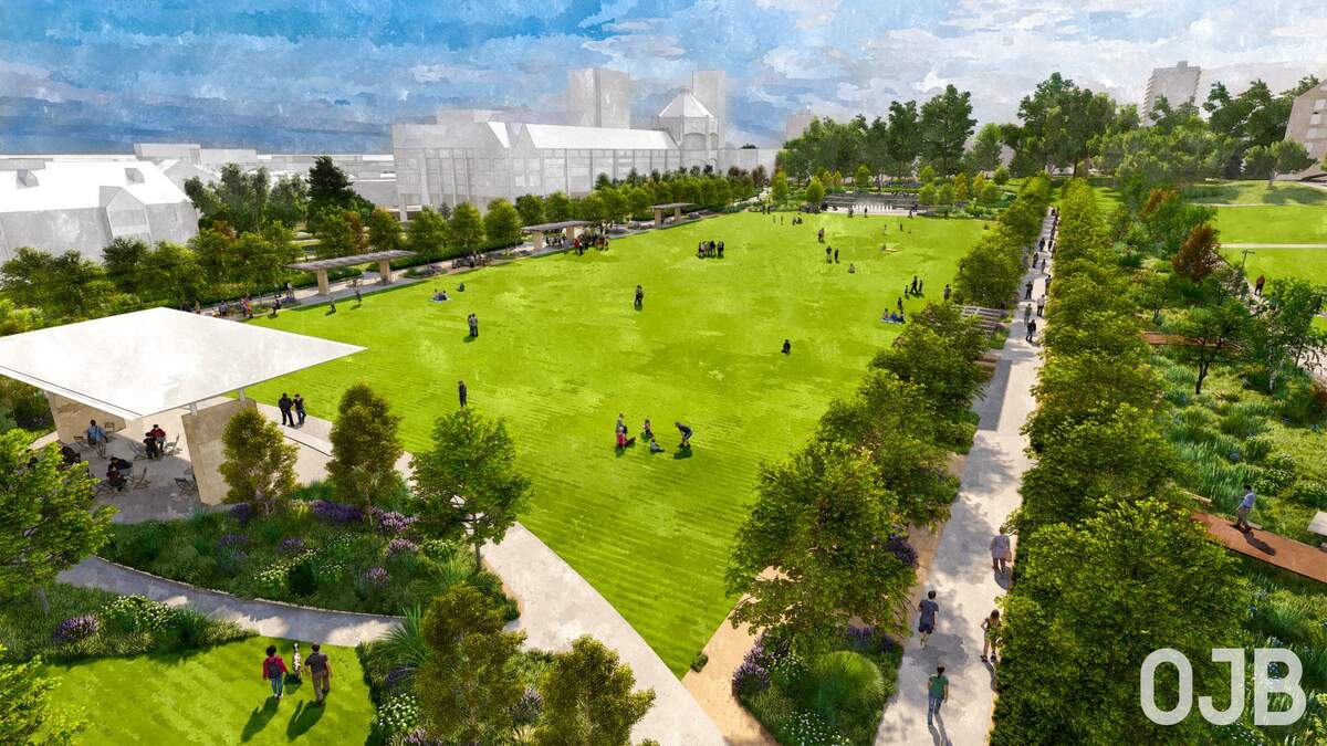 The 5.7 acres of natural grass will include an amphitheater, pavilion, stage, a fountain plaza, and an ellipse with an art installation.