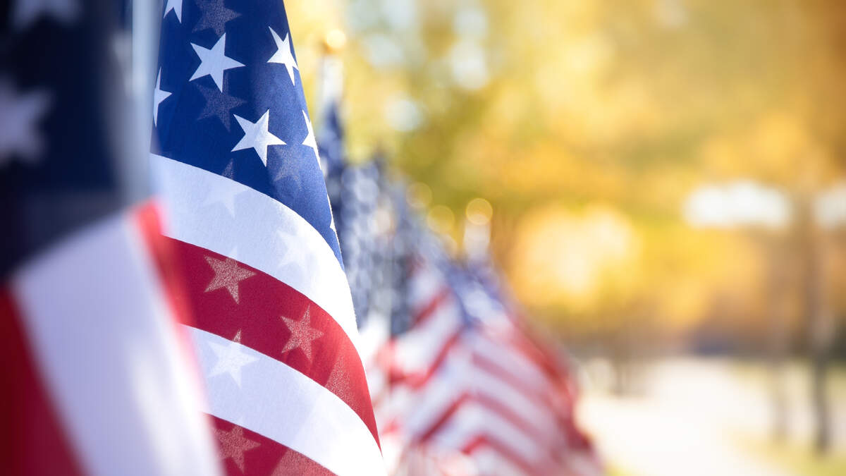 Closeup of an American flag in a row