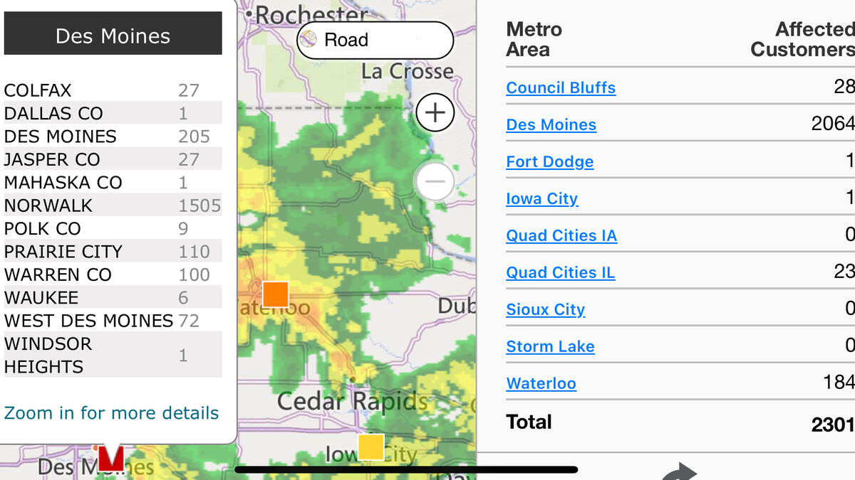 As of 8 A.M., MidAmerican Energy is reporting about 2,000 customers without power in Central Iowa, with more than 1,500 of those in Norwalk.