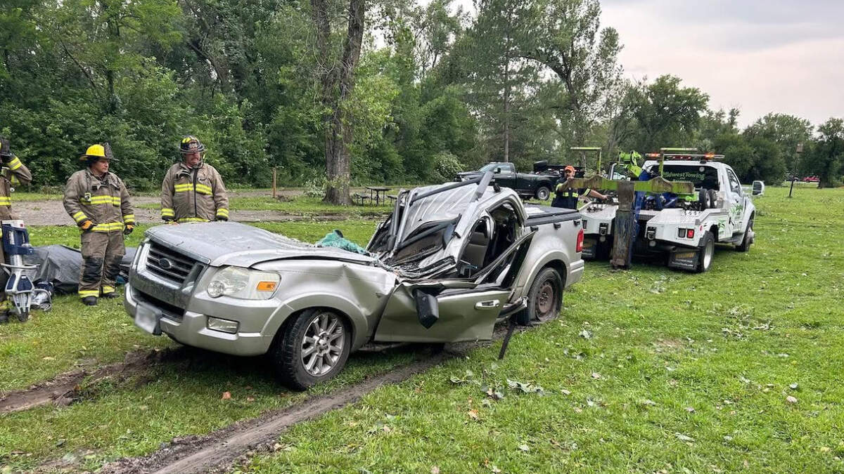 The Waterloo Fire Department says a large tree fell on their truck, killing the woman. The man was trapped in the passenger seat of the crushed truck. It took firefighters more than 90 minutes to extricate him. He was taken to University of Nebraska Medical Center with life-threatening injuries.
