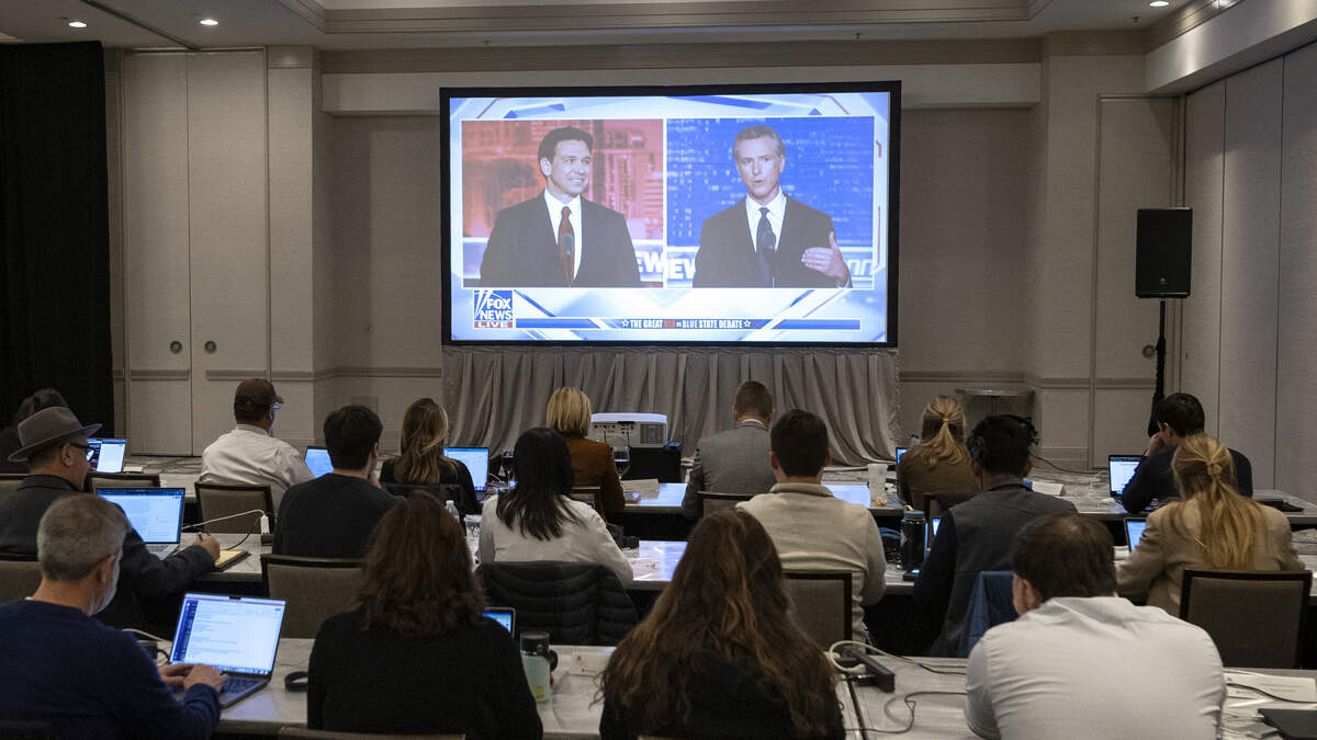 Florida Governor and Republican presidential hopeful Ron DeSantis (L) and California Governor Gavin Newsom (R) appear on screen from the press room during a debate held by Fox News, in Alpharetta, Georgia last night(Photo by Christian MONTERROSA / AFP) (Photo by CHRISTIAN MONTERROSA/AFP via Getty Images)Photo: CHRISTIAN MONTERROSA / AFP / Getty Images