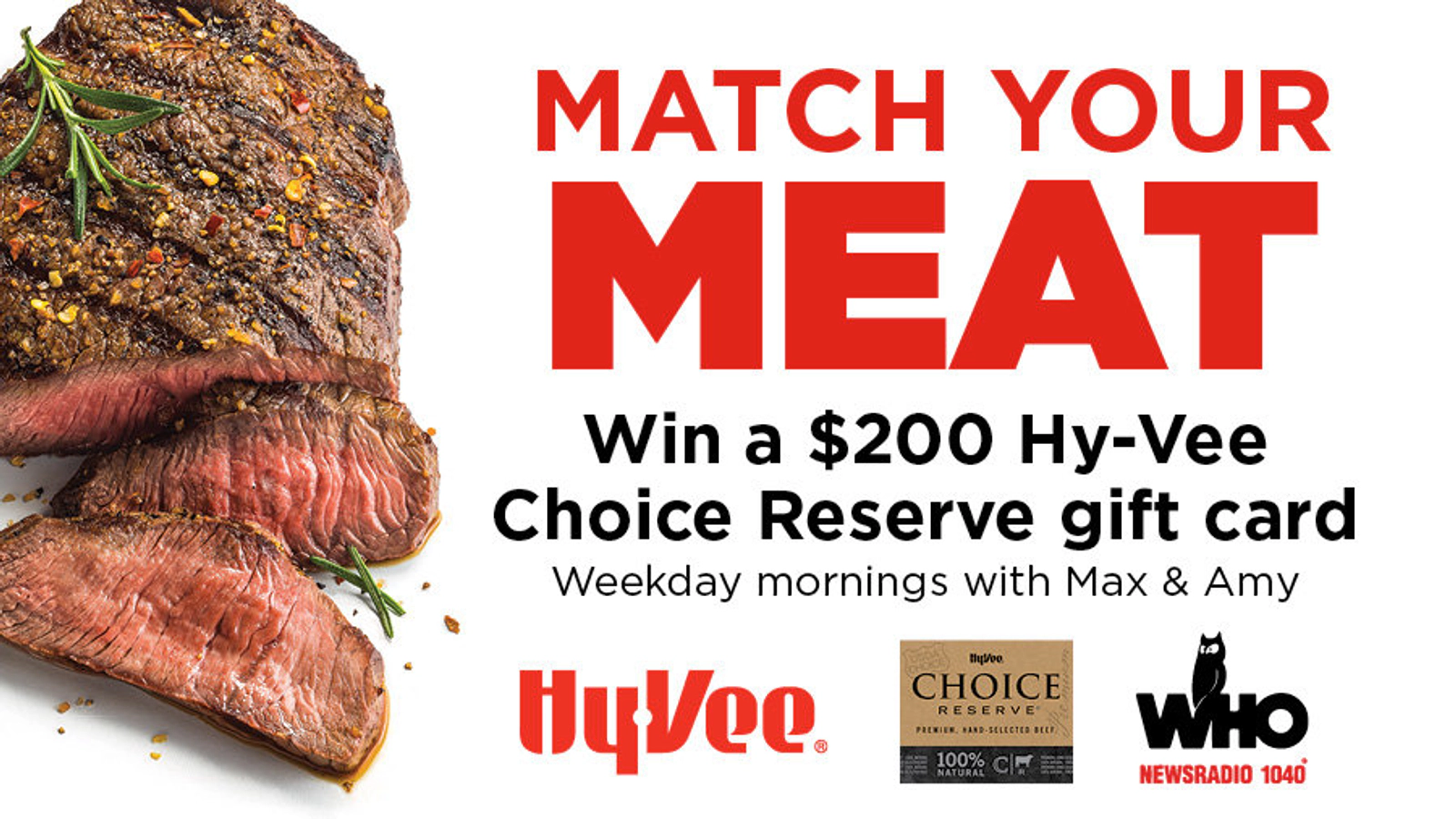 Hy-Vee's "Match Your Meat!" Listen to Max & Amy Weekday Mornings to win a $200 Hy-Vee Choice Reserve Gift Card